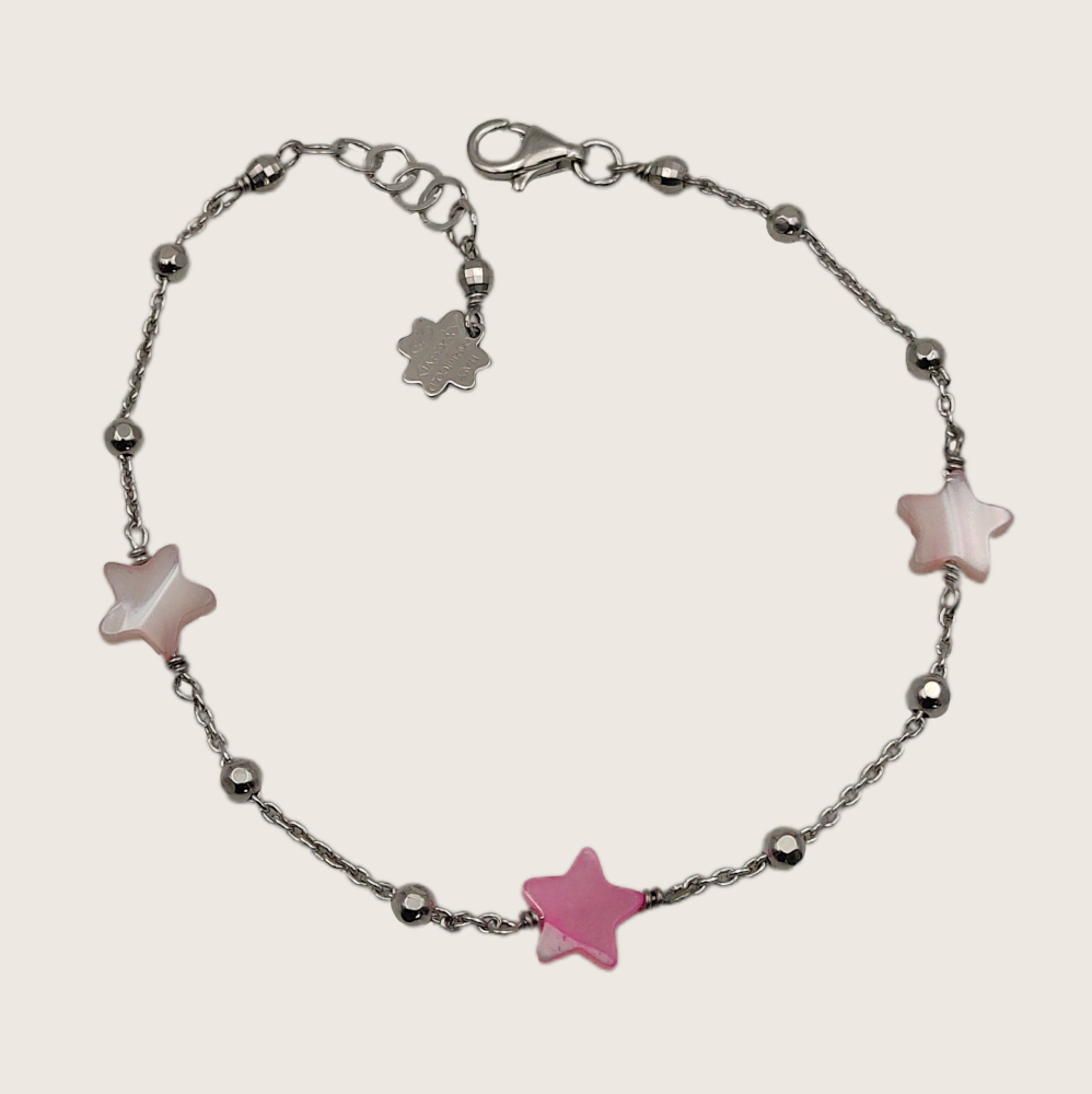 Stelline in madreperla rosa inserite con lavorazione a nodo rosario.