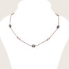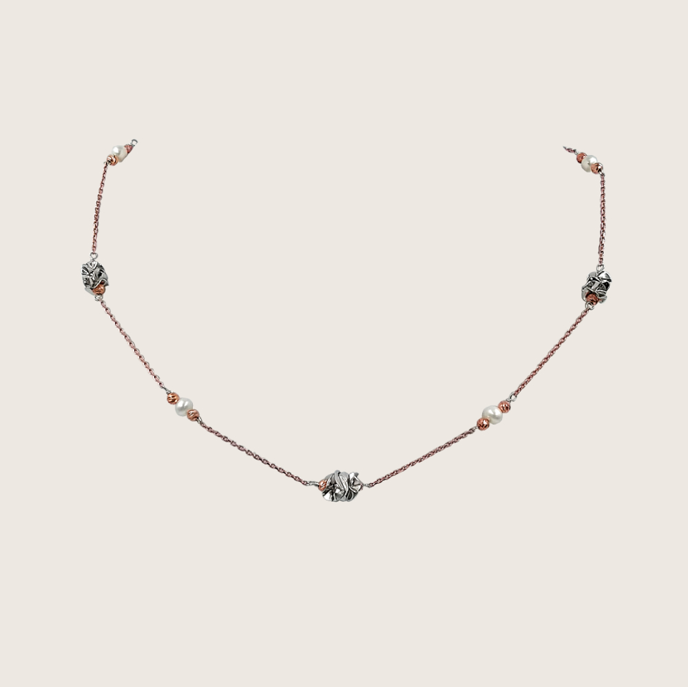 Collana in argento 925 rodiato e placcato oro 18 kt con perle d’acqua dolce e sfere a lavorazione diamantata per dare un ulteriore tocco di luce.