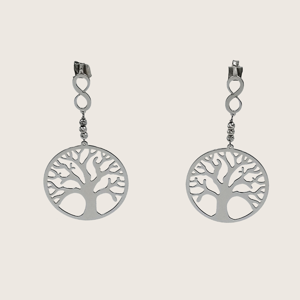 Orecchini con Albero della vita e Infinito impreziositi dall’applicazione di sfere a lavorazione diamantata per dare un ulteriore tocco di luce.