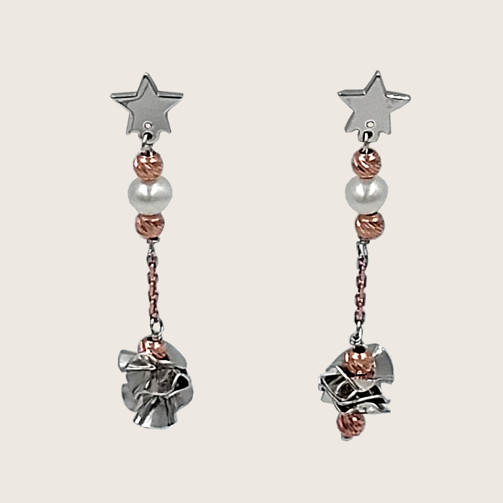 Orecchini in argento 925 rodiato e placcato oro rosa 18 kt con perle d’acqua dolce e sfere a lavorazione diamantata per dare un ulteriore tocco di luce.